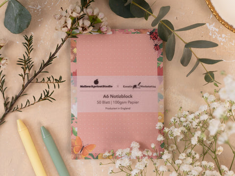 Lass deine Ideen aufblühen mit unserem A6-Notizblock! Er hat 50 leicht abreissbare Seiten aus 100 g/m² Papier. Das verspielte Design einer Frühlingswiese und das Punktraster machen deine Notizen nicht nur praktisch, sondern auch bildschön