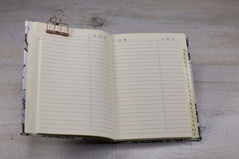 Le carnet d'adresses comporte 96 feuilles de couleur crème cousues au fil. Il est noué à la main et recouvert d'un tissu en toile de haute qualité, comprenant une bande majuscule de couleur assortie.